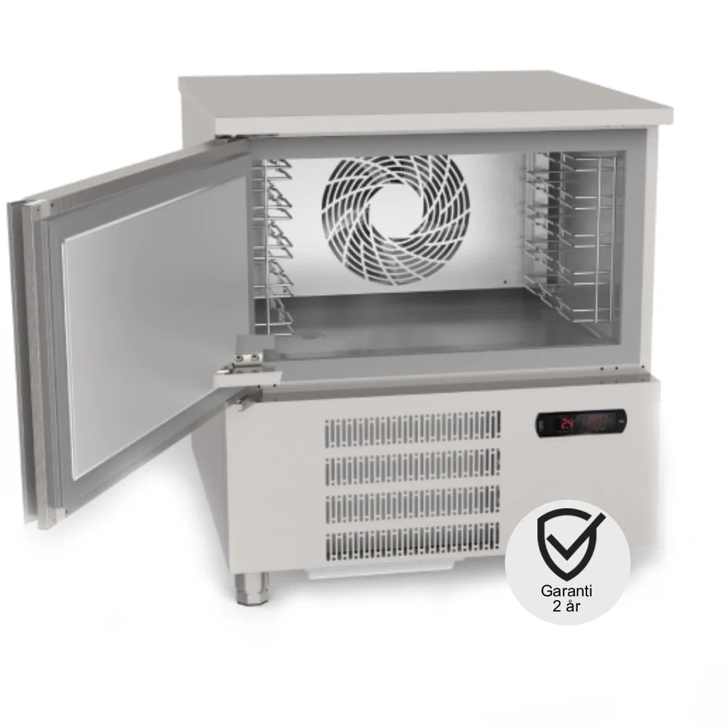 Blastchiller (Snabbfrys- och kyl) med kapacitet på ca.85 L./14 kg. Snabbkylningscykler: +90/+3 °C (120 min.) och +90/-18 °C (270min).