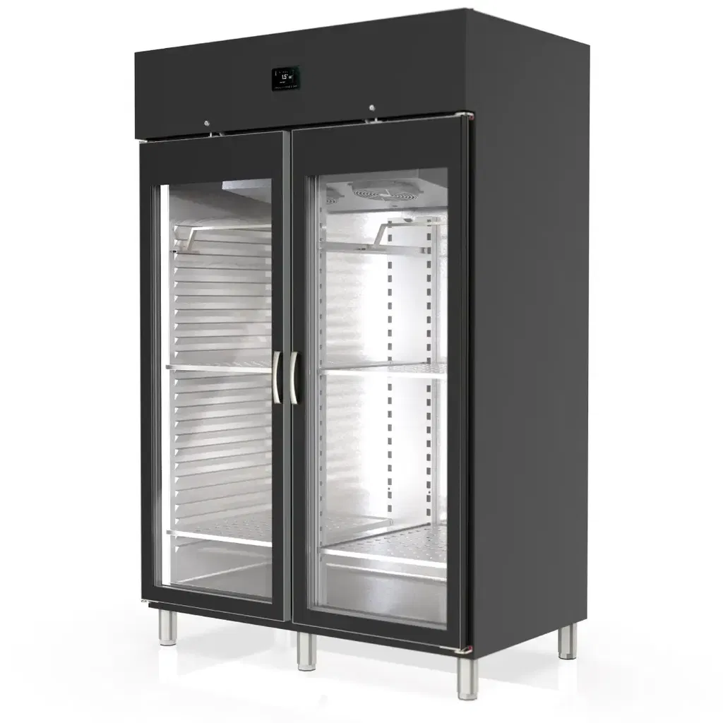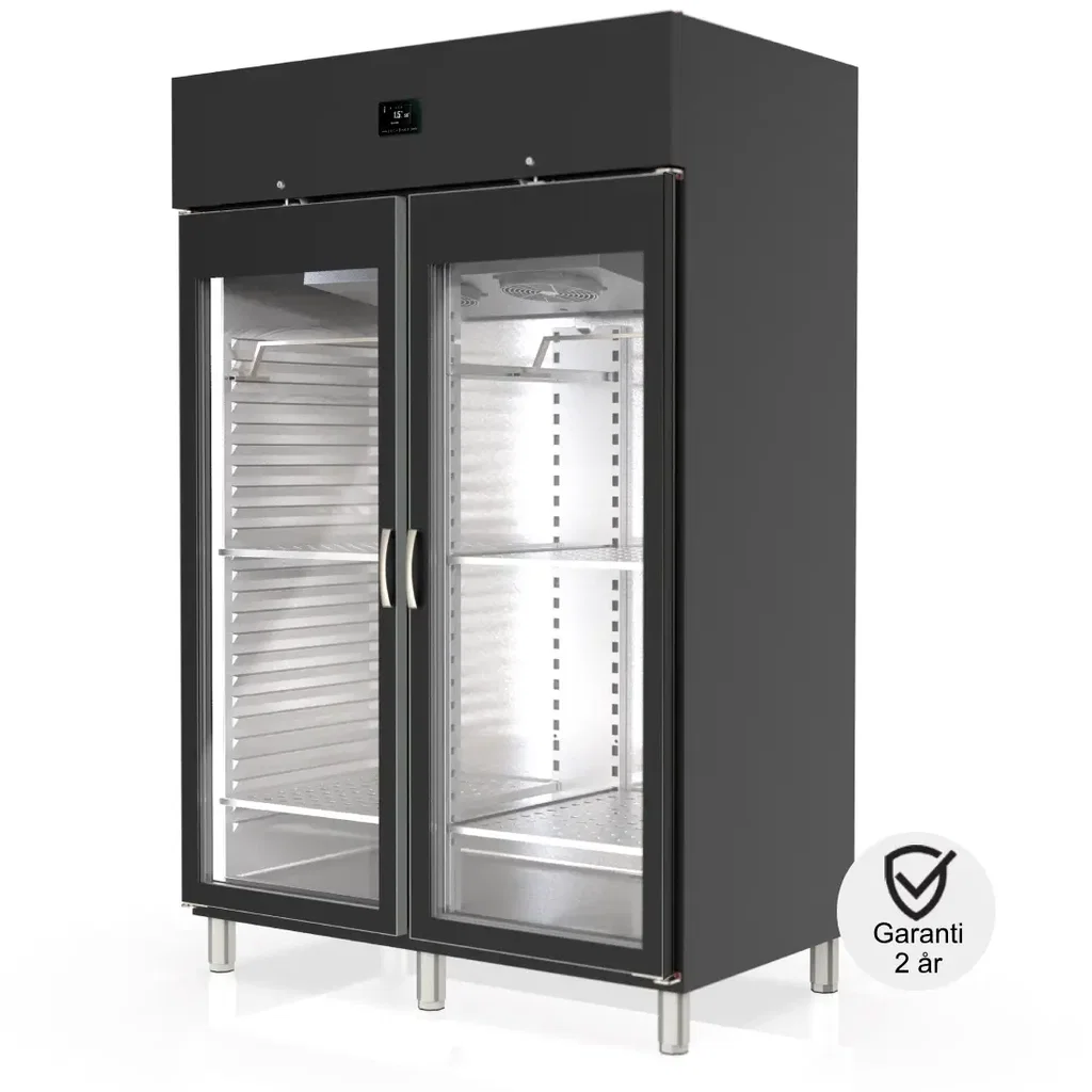 Kött- & mörningsskyl med 2 dörrar. Volym på ca 1404 liter och för mörning upp till cirka 300 kg kött. Svart finish.