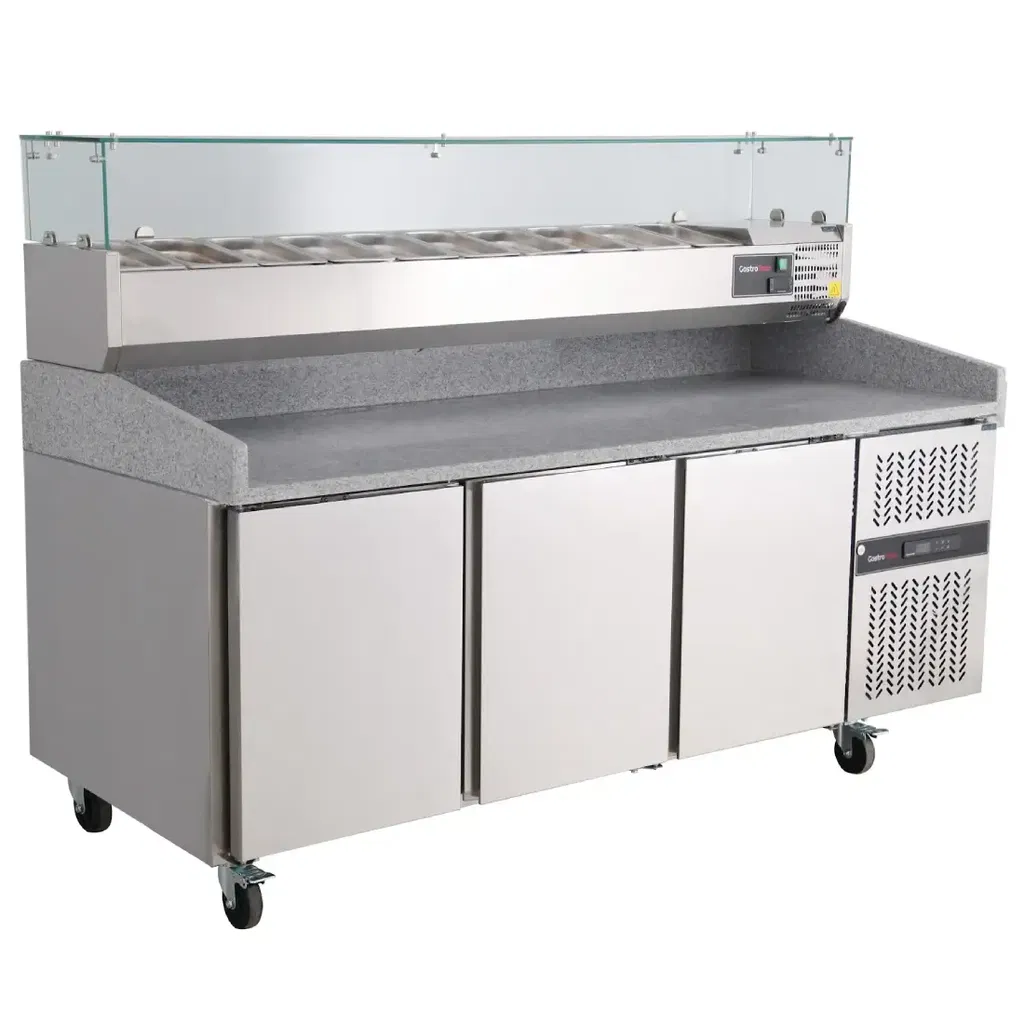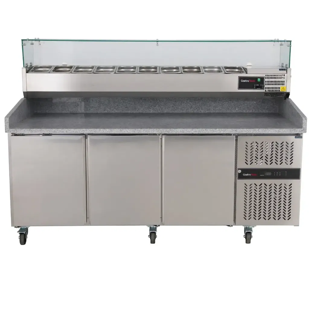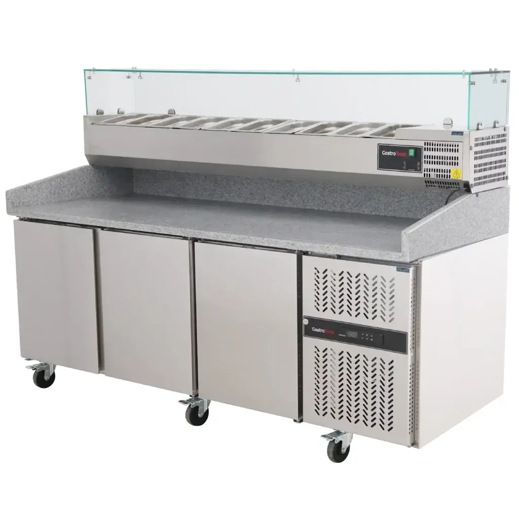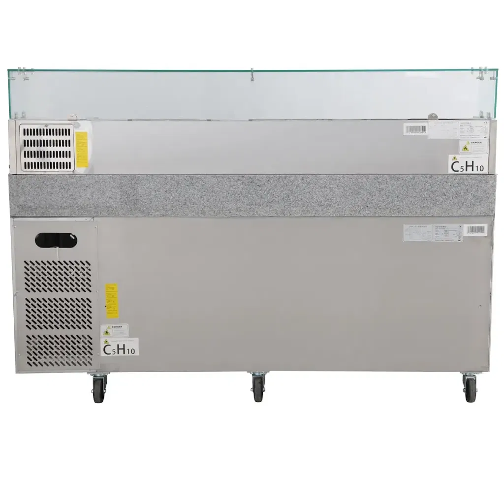 Komplett setup av pizzabänk inkl. upphöjd kylränna. Kantiner ingår ej.