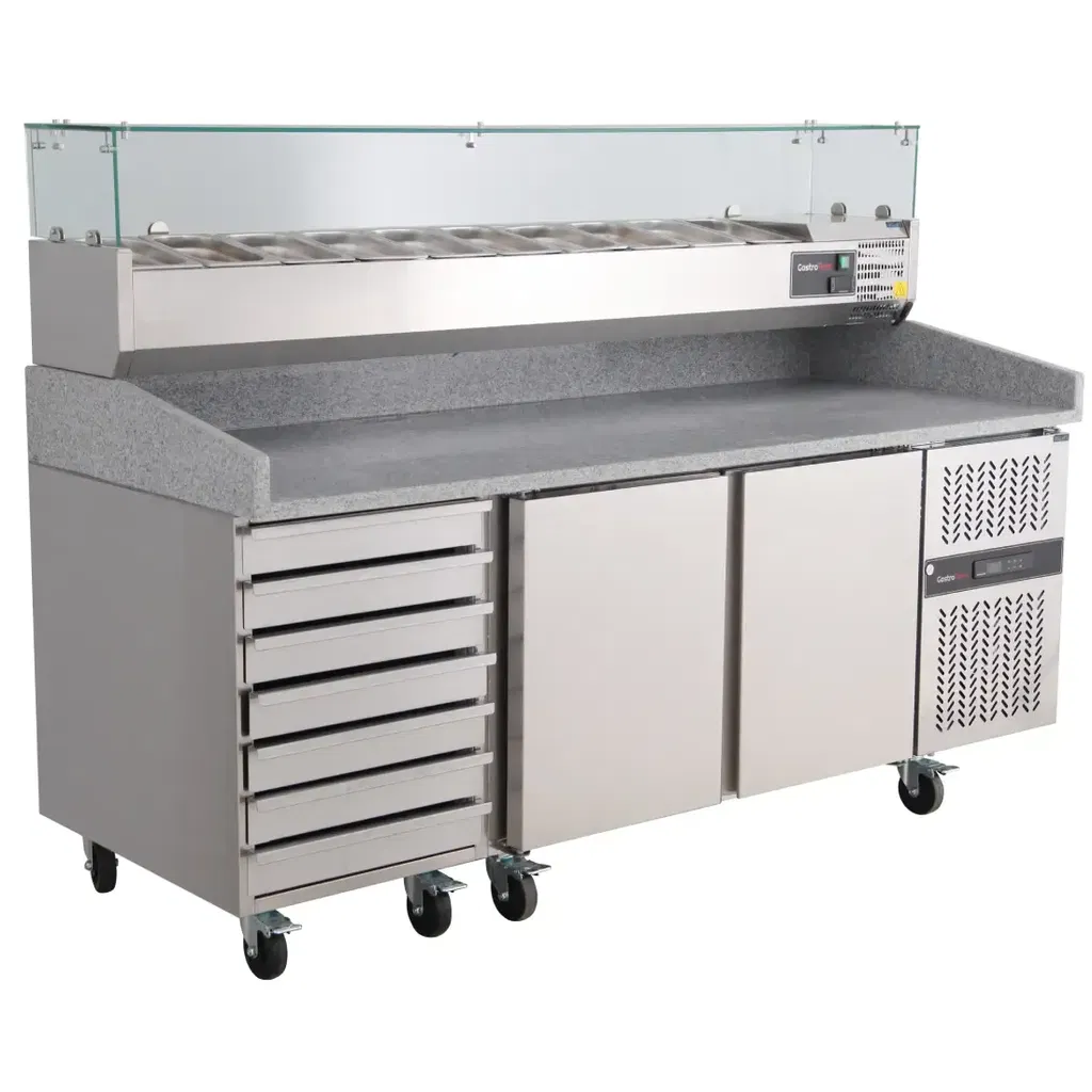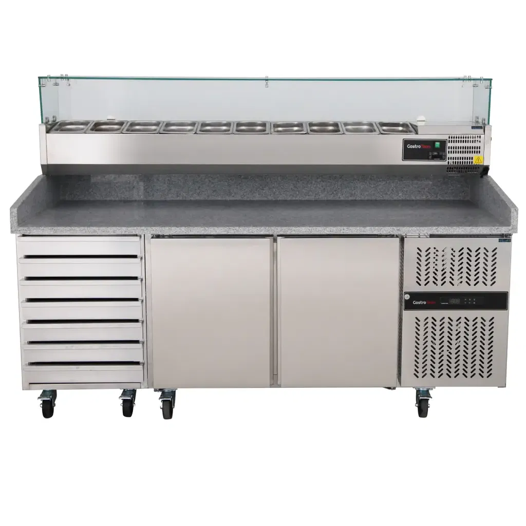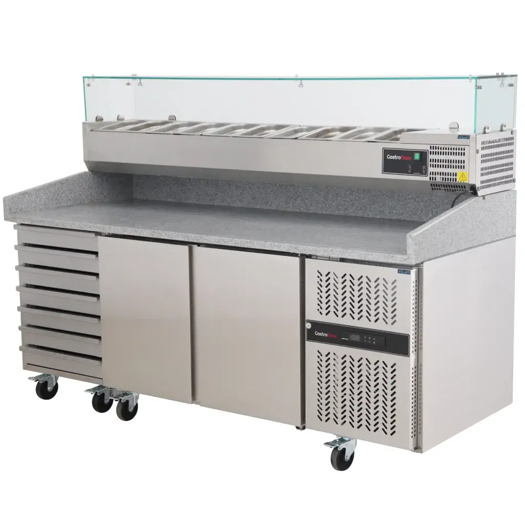 Komplett pizzabänk inkl. upphöjd ränna. 2 centrerade dörrar och 7 praktiska neutrala draglådlådor för förvaring av degbollar, etc. Kantiner ingår ej, köpes till.