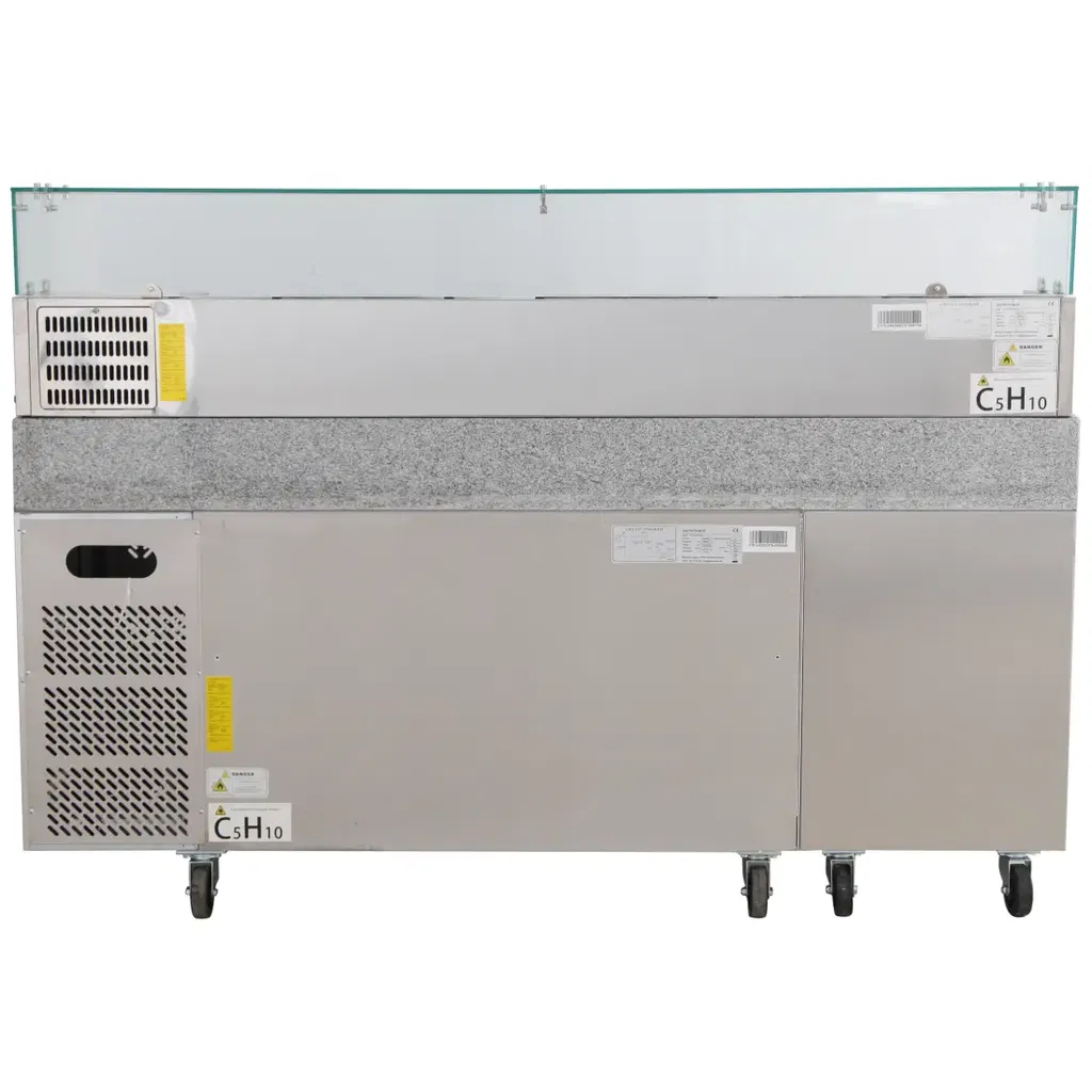 Komplett setup av pizzabänk inkl. upphöjd kylränna. Kantiner ingår ej.