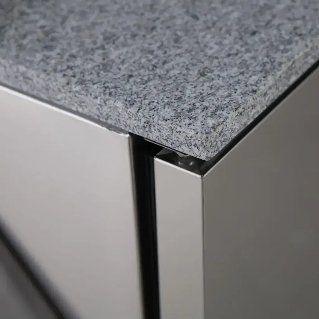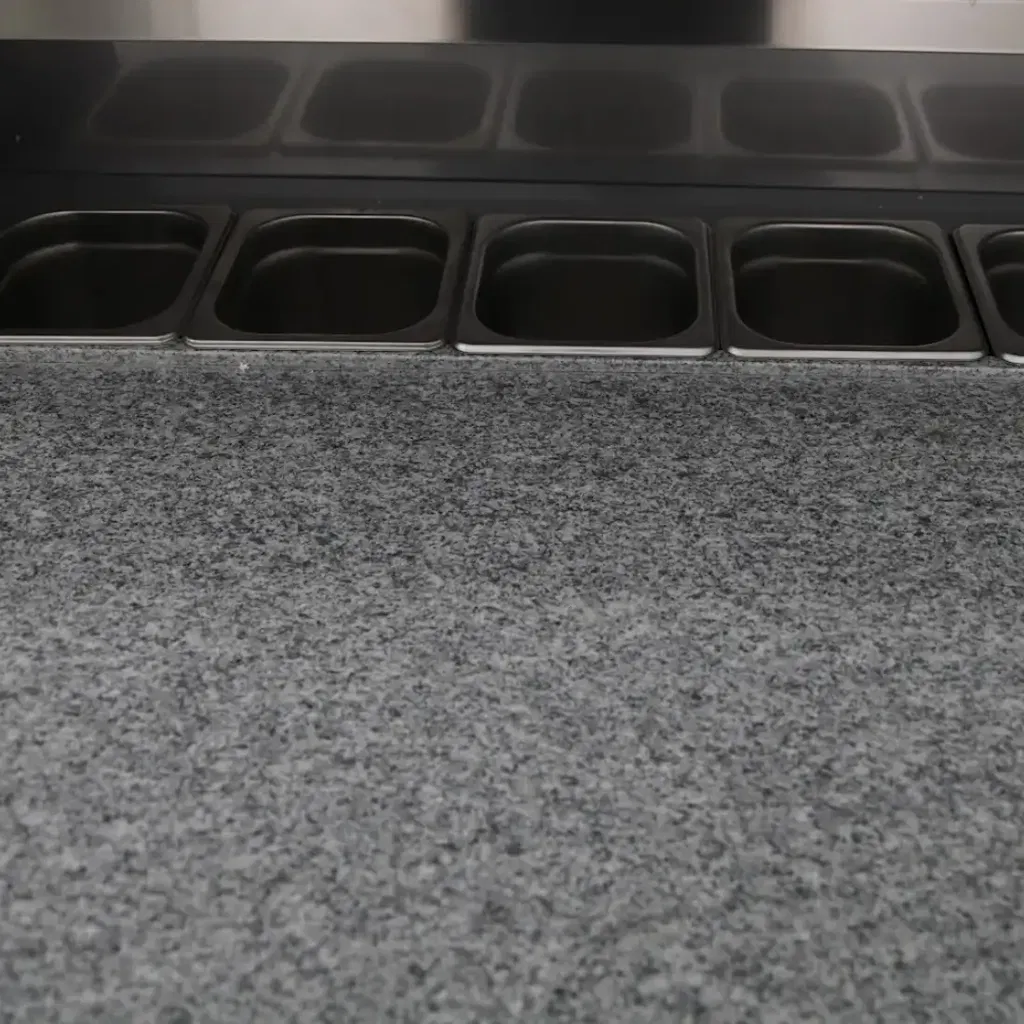 Kallskänksbänk med granittopp och hylla.